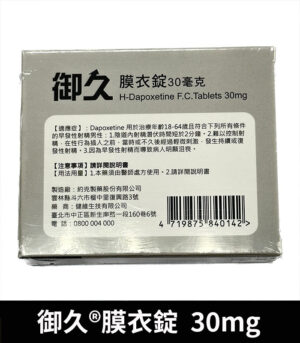 御久 30mg 是一款針對男性早洩(Premature Ejaculation, PE)問題設計的處方用藥,主要成分為 達泊西汀 Dapoxetine,每顆含量為 30mg。達泊西汀為首個獲准用於治療早洩的 SSRI(選擇性血清素再吸收抑制劑)類藥物,臨床實證可顯著延長性愛時間,增強射精控制力,提升性生活滿意度與自信心。