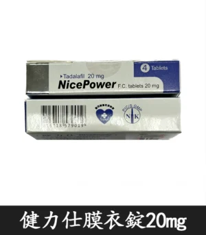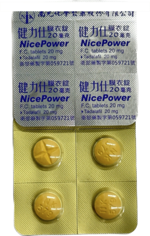 - 每盒含 4 錠 健力仕膜衣錠 NicePower 20mg,每錠含 20mg Tadalafil(犀利士成分)。