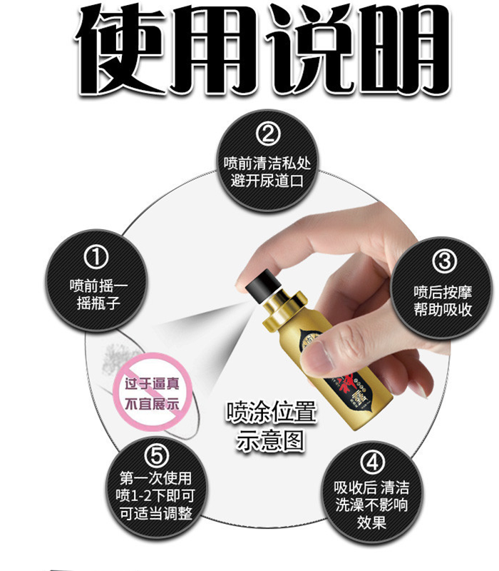 6.不可塗於尿道口處,因尿道口肌膚比較敏感,如噴塗上面有輕微不適感,請用冷水清洗即可