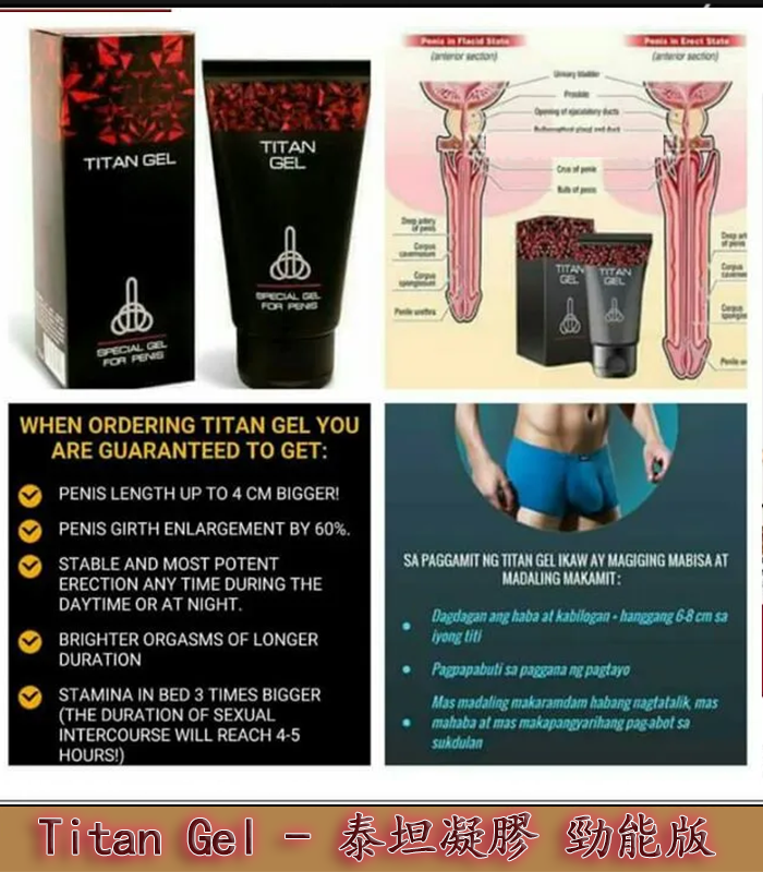 泰坦凝膠 Titan Gel 是一款針對男性設計的天然增大膏,旨在有效提升陰莖的尺寸與性功能。這款凝膠採用了獨特的草本成分配方,經過臨床實驗證實,能夠顯著增長陰莖長度和周長,並且增強性生活的質量與持久力。Titan Gel 是您實現自信提升的理想選擇。